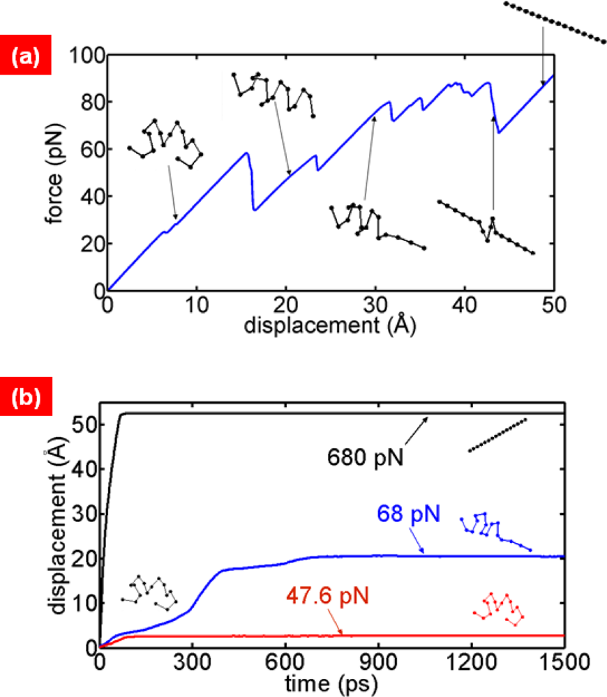 (a) Force-extension curve for alpha helix (pdb: 1akg) obtained from coarse-grained MD simulation using Gō potential field. Here, the simulation considers the stretching of alpha helix with constant pulling speed. Inset shows the carbon backbone structures corresponding to force peaks. It is shown that force peak in saw tooth-like pattern indicates the rupture of hydrogen bonds in alpha helix. (b) Time-extension curve for alpha helix obtained from coarse-grained MD simulation, where alpha helix is stretched with constant force applied to termini. It is shown that, at very small force, the folding structure of alpha helix is unlikely to be unfolded. At high force, the all-or-none fashion of unfolding has been observed for alpha helix.