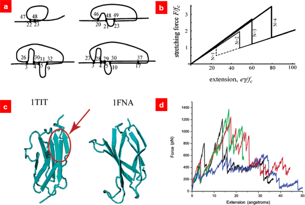 (a) Optimal configuration of cross-links for cross-linked polymer chain molecules from optimization problem. (b) Force-extension curve of such cross-linked polymer chains. The all-or-none fashion of rupture of cross-links has been observed for optical cross-link configurations. (c) Two protein domains such as immunoglobulin (Ig) domain and fibronectin (fn) III domain are considered, since the molecular structure of Ig domain is quite similar to that of fn III domain except the parallel strand, similar to optical cross-link configuration, for Ig domain. (d) Force-extension curves of Ig domain (black, red, and green solid lines) and fn III domain (blue solid line) show that parallel strand enhances the mechanical resistance of protein domain. Figures are adopted from Ref. [85].