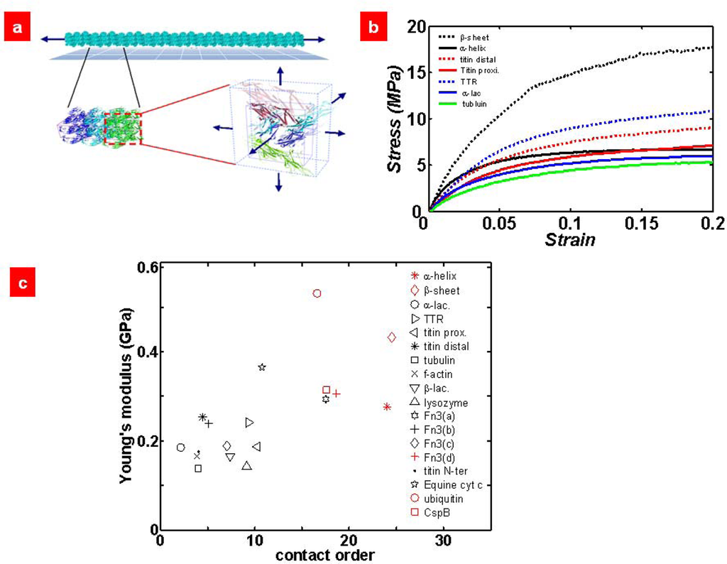 Buehler [91,92] have taken into account the micromechanics model base on all-atom simulations, while Eom and coworkers [93] have considered the coarse-grained model such as the Gō model with micromechanics models. Specifically, the RVE is stretched based on a constant, normal strain, and then the atomic coordinates of the alpha carbon atoms are updated. Since the atomic coordinates updated after application of strain field to RVE is not in an equilibrium state, the equilibrium coordinates of alpha carbon atoms are obtained from energy minimization. At equilibrium state, the virial stress theory [94] was used to compute the atomic stress acting on RVE due to strain field. Once the stress-strain field is found, the Young’s modulus is easily obtained as E = ∂s/∂e, where e is the normal strain and s is the virial stress. Figure 8 shows the stress-strain relation for given protein materials with assumption of Gō-like model for protein crystal in RVE. Remarkably, it is shown that the contact-order plays a critical role on Young’s modulus as well as yield stress in the protein materials. This sheds light on the role of native topology on the mechanical properties of protein materials.