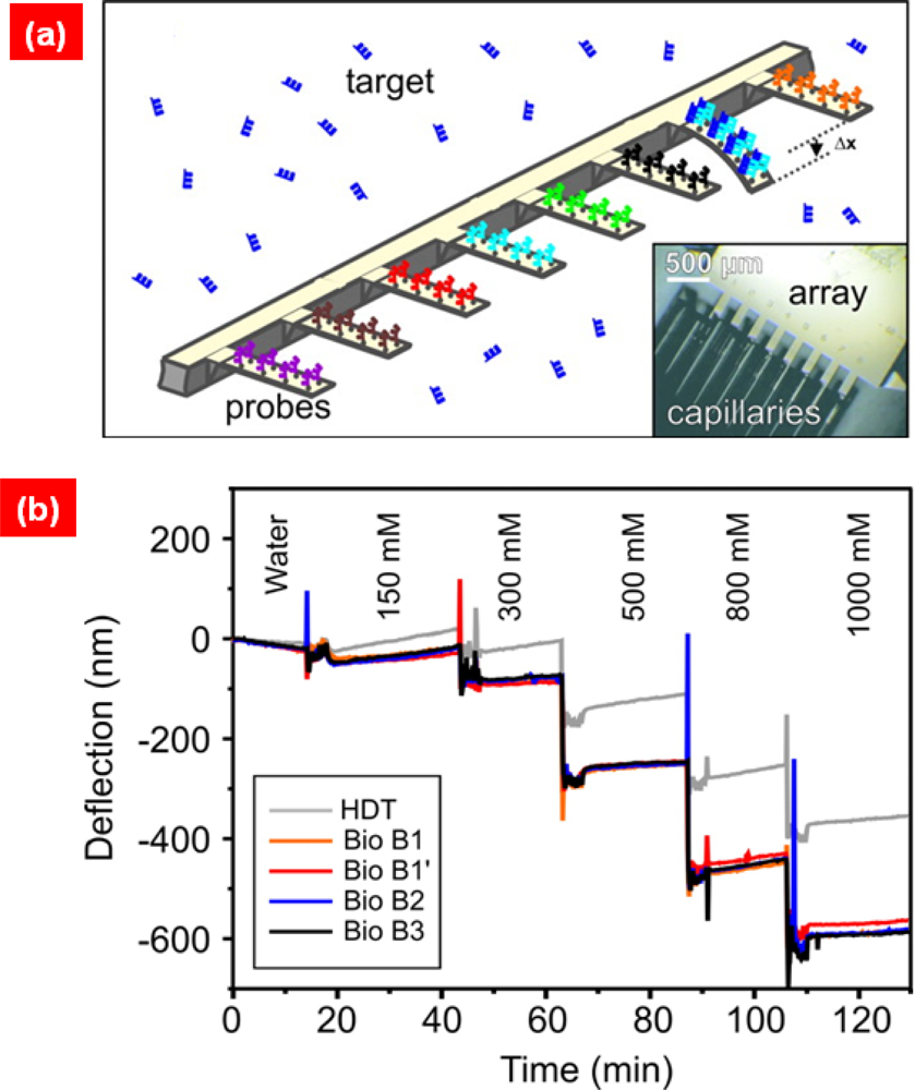 (a) Schematic illustration of functionalized cantilever array for detection of specific biological molecules. Inset shows the microscope image of cantilever array. (b) Cantilever bending deflection change of cantilever array induced by change of ionic strength in the buffer solution. Figures are adopted from Ref. [97].