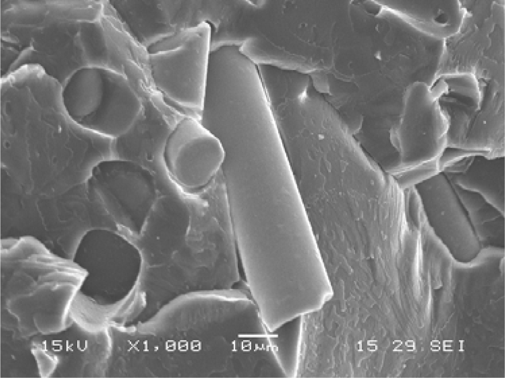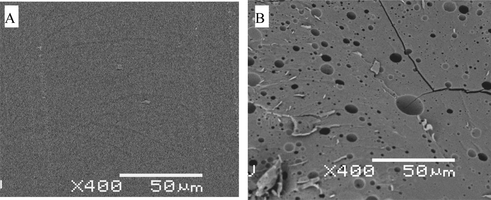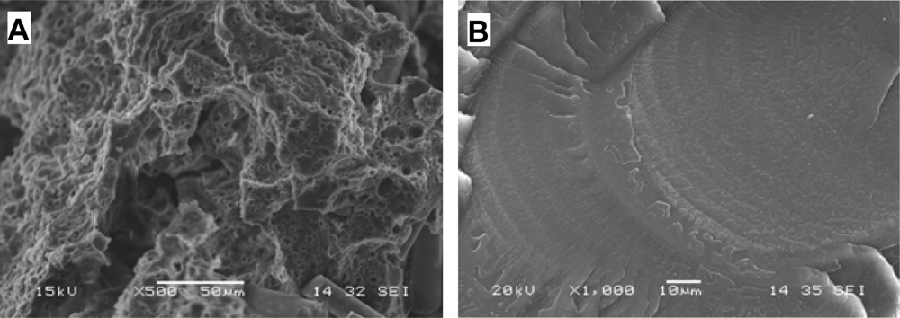 Morphologies of the cross-section (cryo-fracture) of a polyether polyurethane/glass fiber composites after soaked in the H2O2/CoCl2 solution for 56 weeks (A). Microporosity forms in the polymer matrix due to oxidation. For comparison, the cross-section morphology of pure polyurethane samples that were soaked in H2O2/CoCl2 solution for 56 weeks is showed in B.