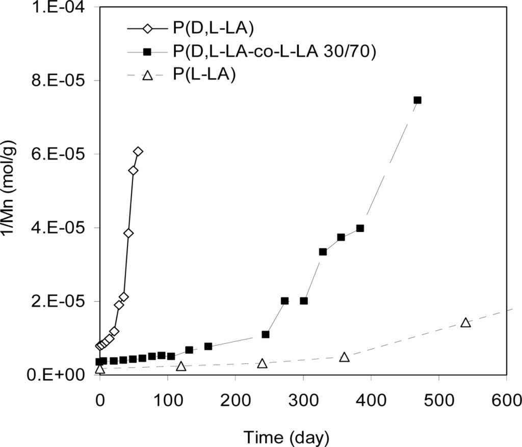 Degradation of crystalline P(l-LA) and amorphous P(d,l-LA-co-l-LA 30/70) and P(d,l-LA 50/50). The reciprocal molecular weights measure the concentration of degradation products. P(l-LA) had slowest increase in reciprocal molecular weight as a function of time, indicating it degraded slowest compared to the other two amorphous materials.