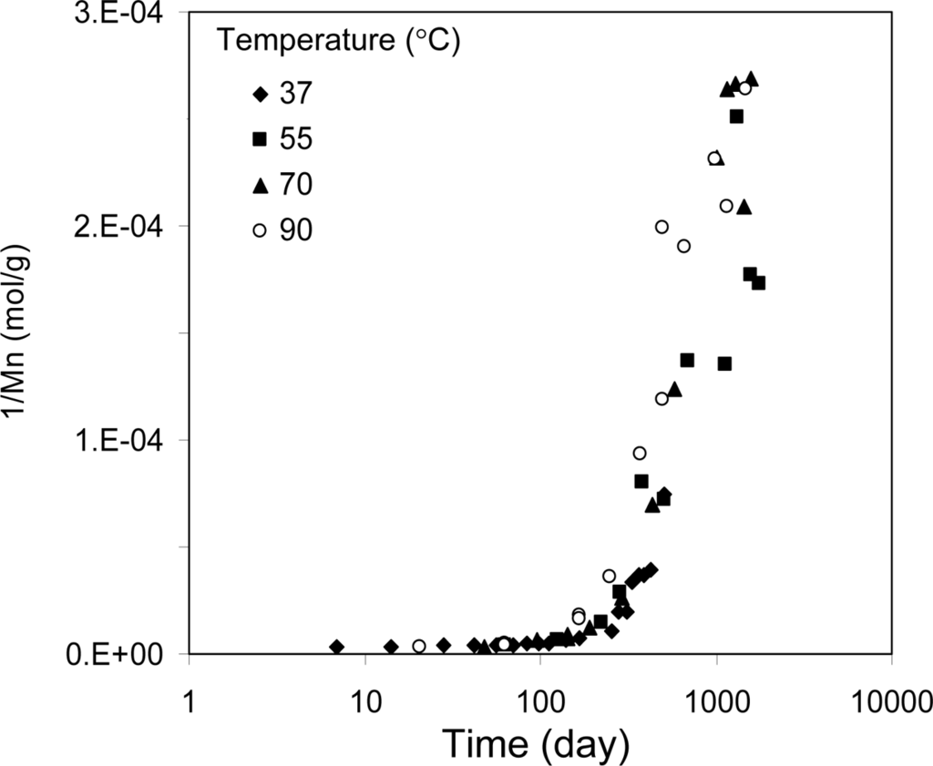 This says that if degradation is a 2nd order reaction, 1/Mn should have a linear relationship with time. In certain cases, the chain ends are acids and catalyze the hydrolysis. This is the so-called autocatalysis or auto-accelerated degradation. In this case, the reaction rate is proportional to the chain end concentration as well as water and hydrolytic bond concentrations, and we would have: