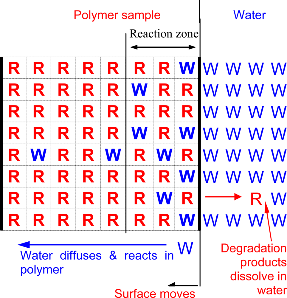 Schematic of surface erosion. There is a reaction zone near the sample surface. Within this zone water concentration follows a gradient and the degradation reaction is controlled by kinetics instead of diffusion at a molecular level. Beyond this zone, the degradation reaction is very slow because the water concentration is low. Diffusion of water affects the degradation reaction at a macroscopic scale but not at a molecular scale.