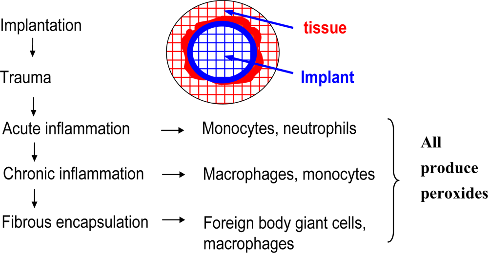 Schematics of inflammatory reactions of tissue to the implants. All the cells, lymphocytes, monocytes, macrophages, and foreign body giant cells produce oxides and release them into the implant.