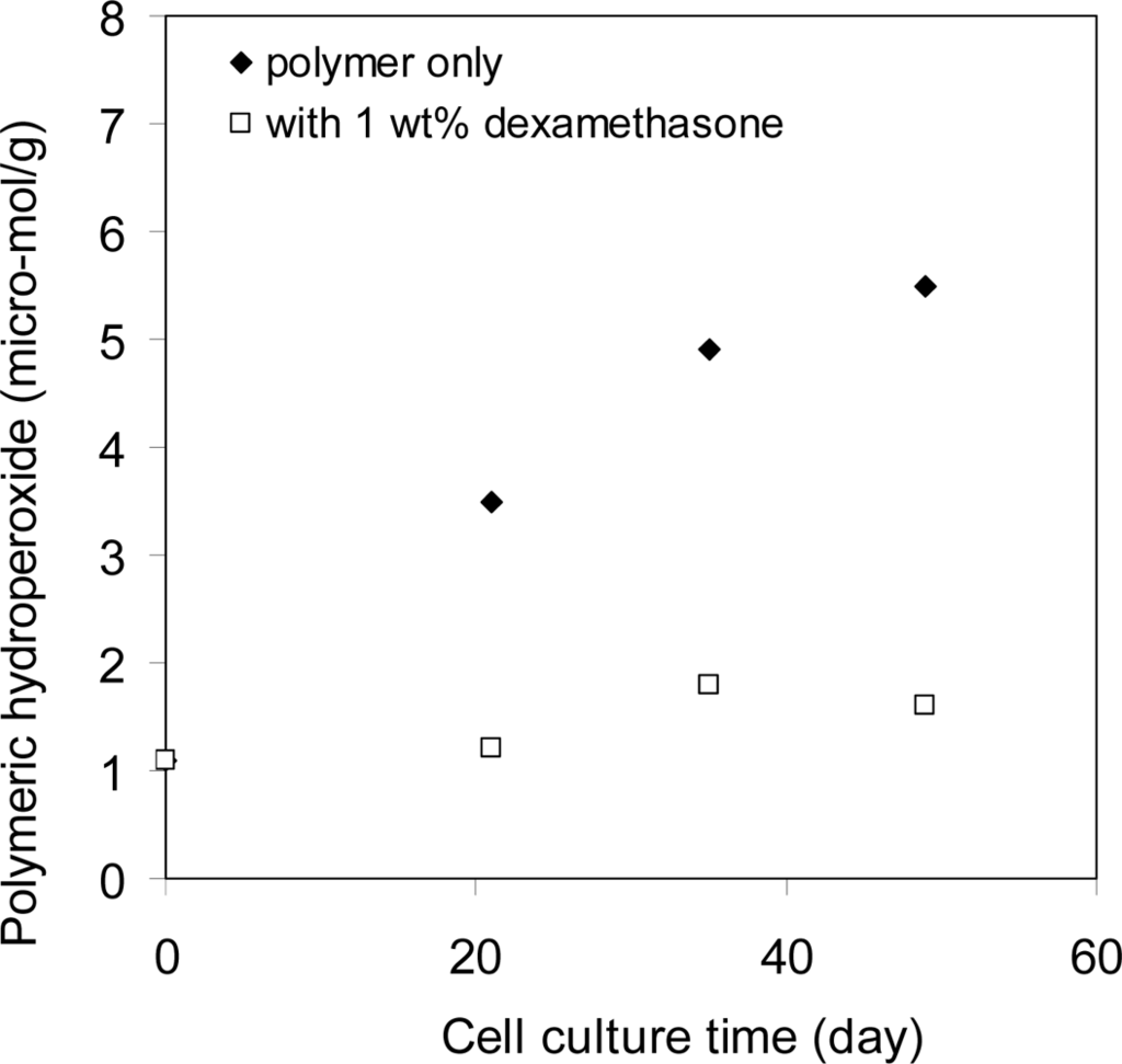 Polymeric hydroperoxide formation in a polyether polyurethane (Pellethane® 80A, Dow). Human monocytes and macrophages were cultured on the surface of the polymer films. The hydroperoxide concentration was measured via an iodometer. The samples were made with either polymer only or the polymer with 1 wt% of dexamethasone (re-plotted based on reference ).