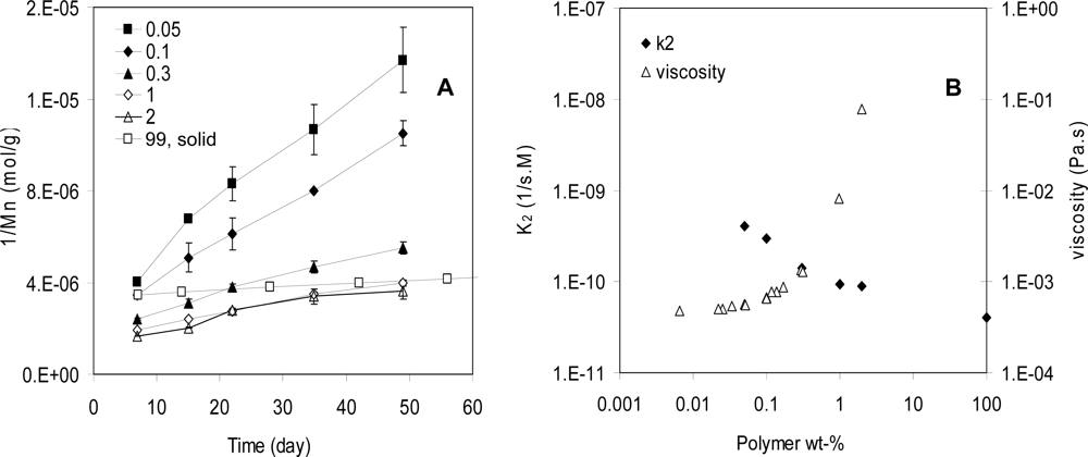 A, 1/Mn versus time for PLA in tetrahydrofuran (THF) solutions and solid samples. Dilute solutions include those with 0.05 and 0.1 wt% of polymer where individual polymer chains dispersed in solvents. Concentrated solutions include those with 0.3 to 2 wt% polymer where polymer chains entangled with each other. The solid sample contains 99 wt% polymer. All the samples contained 1 wt% of water (made by adding 1 wt% of water to the PLA solutions in THF). B, hydrolysis rate constant k2 and viscosity of solutions versus polymer concentration. The viscosity is reciprocal to the molecular mobility.