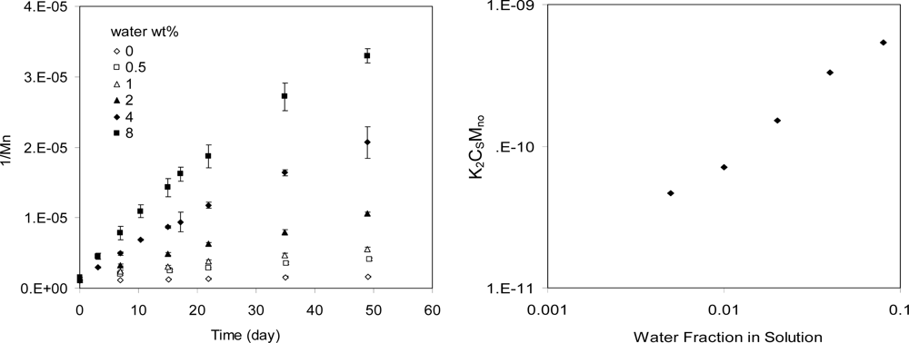 Hydrolysis rate of polymers should be proportional to water concentration. There have been very few experimental studies to directly confirm this, especially for water insoluble polymers such as polylactide and other polyesters. One direct experimental measurements was also made with poly-(l-lactide-co-d,l-lactide 70/30; Mn = 300 kg/mol). This polymer is not soluble in water. It was dissolved in tetrahydrofuran (THF) at low concentration (0.3 wt%). Various amounts of water were added to the solutions. The degradation results are shown in Figure 3. 1/Mn is nearly proportional to time, which indicates the hydrolysis follows 2nd order kinetics. Based on Equation 3, the slope of the curve is k2Cs/Mn0. This slope was plotted as a function of water concentration Cs. Hence, the proportional relationship between the hydrolysis rate and water concentration was demonstrated (Figure 3B).