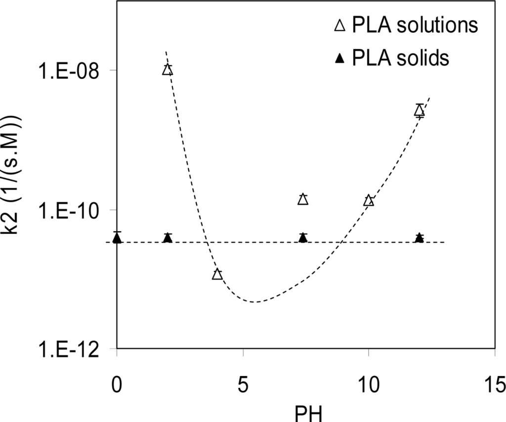 The effect of pH on the hydrolysis reaction of polymers has been studied in a few reports. Figure 4 show the hydrolysis of PLA in THF solutions with nominal pH varying from 0 to 14. As shown, the slowest reaction rate was at pH 4. This is because the PKa of lactic acid is 3.84 []. In a solution with pH > 4, the lactic acid is mainly in the dissociated form, which accelerates the hydrolysis. In solutions with pH < 4, lactic acids at the chain ends prefer the associated acid form, which also accelerates the hydrolysis reaction via auto-acceleration. Therefore, the degradation rate of polymer solutions is the slowest at pH 4. However, similar effects of pH on degradation have not been observed in solid polymer samples. This is because the ions such as H+ or OH− have very low solubilities in solid polymers, so they cannot diffuse readily into the solid samples to affect the bulk hydrolysis. As shown in Figure 4, the hydrolysis rates of solid samples (solid triangles) are not sensitive to the pH of the media.