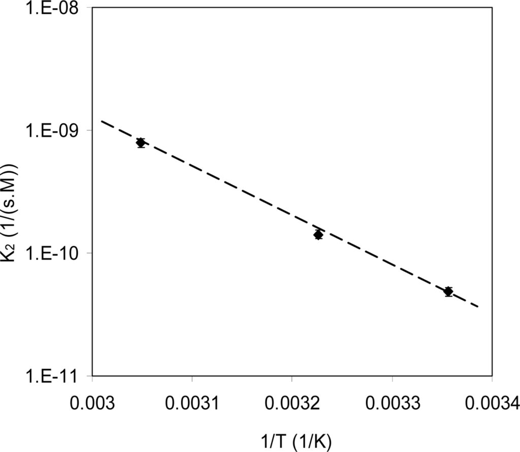Hydrolysis rates of polylactide in THF solutions fit the Arrhenius equation. Figure 5 shows the degradation rate constant (k2) of PLA in THF solution (0.3 wt%) as a function of the reciprocal of testing temperature. The linear curve indicates the degradation of PLA in solution is controlled by activation energy. The activation energy in this case was 76 KJ/mol (in a temperature range from 25 to 50 °C).