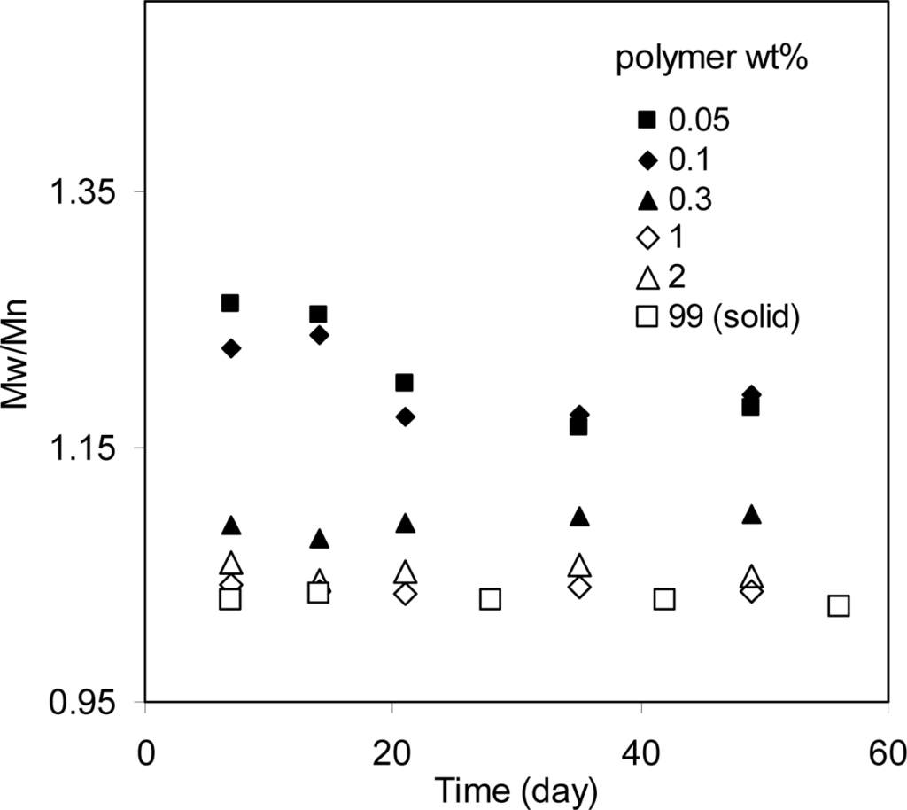 There is a debate about how the hydrolytic activity of a polymer bond is related to its position in a polymer chain. Some authors have suggested that the bonds near chain ends have higher activity [] while others argue that all the bonds have equal activity and they degrade randomly. One experiment that may determine whether all polymer bonds have equal reactivity is to measure the polydispersity index (PDI) of the molecular weight distribution. A larger polymer chain coil has more bonds than a smaller one. If each bond has equal reactivity, the larger chain would have a higher likelihood of reacting with water and more quickly degrading into smaller chains. For analogous reasons, smaller chains should degrade slower. As a result, the polymer chains tend to become similar in size, or a PDI approaching 1. If the bonds near the chain ends degrade faster, smaller chains would degrade relatively faster than larger ones and the PDI of whole samples would increase as a function of time. Figure 6 shows the PDI of PLA degraded in solutions of different concentrations (with 1 wt% of water). The PDI of dilute solutions decreased. For concentrated solutions or solid polymer, the PDI did not change significantly with time. In these samples, the Mn decreased by almost 50%. If the bonds near chain ends are responsible for these molecular weight changes, the PDI should have a significant increase instead of no change. Therefore, these results suggest that the all the bonds have equal reactivity within these testing periods.