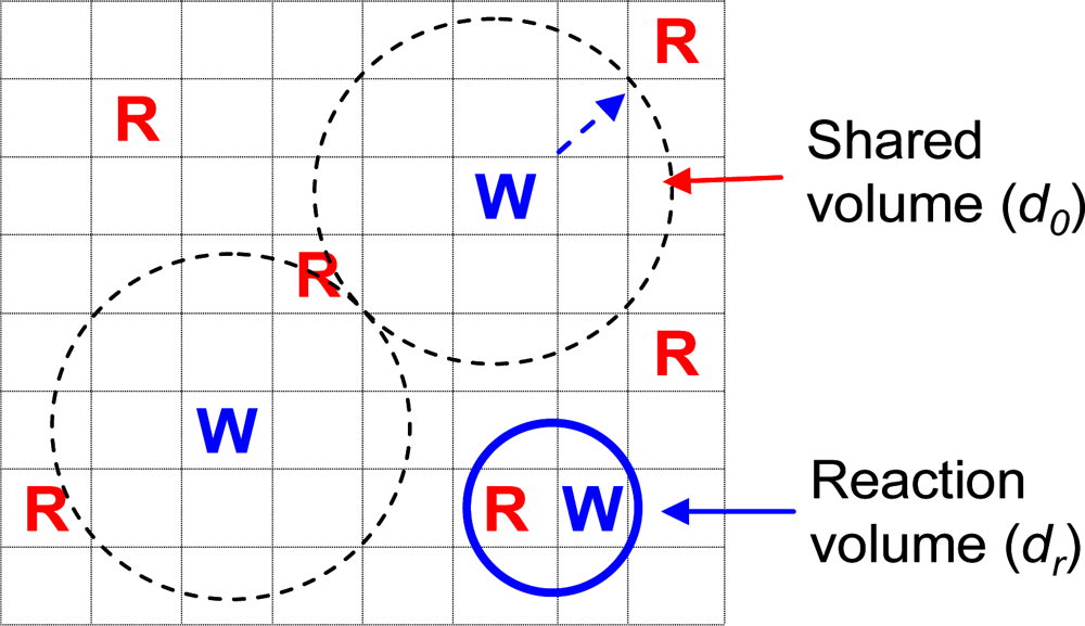 Characteristic lengths in a solid reaction system. R represents reactive polymer bonds and W represents water molecules. Each water molecule shares a volume of diameter d0. R and W have to move into a reaction volume of a diameter of dr in order them to react.
