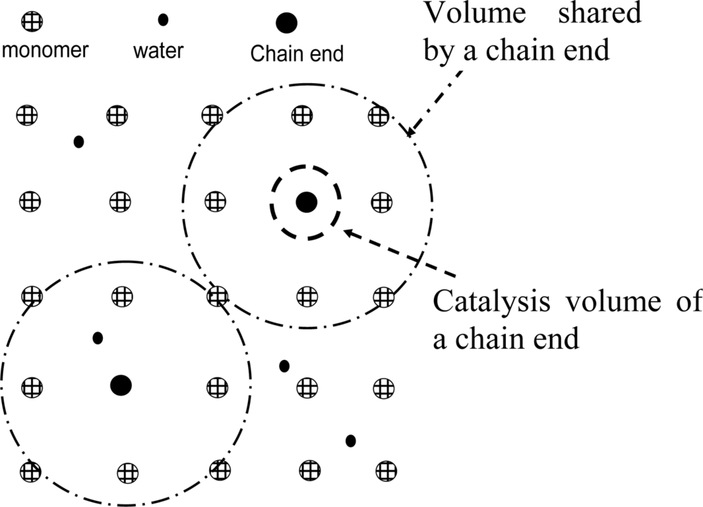 Chain ends E may be able to catalyze the reaction between a polymer bond R and a water molecule W. However, E can catalyze only those R-E pairs that are sufficiently close to a E such that it can diffuse to them. Therefore, only a certain percentage of R-W pairs within the shared volume of E can have an accelerated reaction rate [].