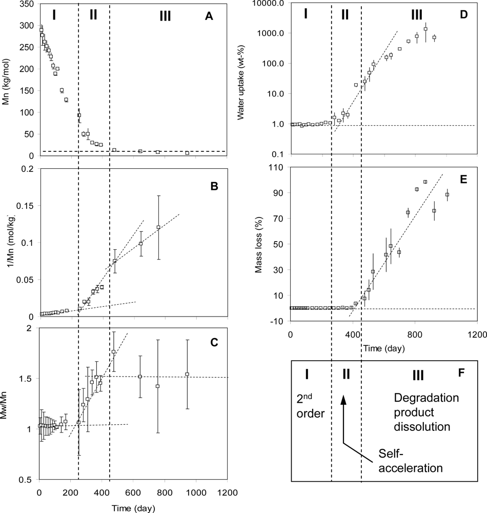 Experimental results of bulk degradation of solid PLA (70% l-lactide-co-30% d,l-lactide) at 37 °C. The degradation has three stages. The first is 2nd order hydrolysis. The second stage is auto-accelerated, and the third is dissolution of degradation products. These stages are shown by the zones separated by the vertical lines in panel (F) [].
