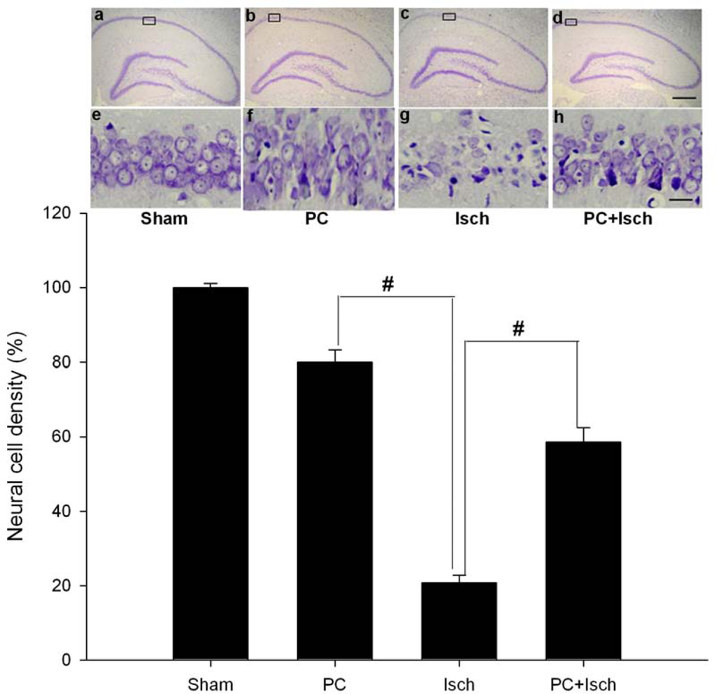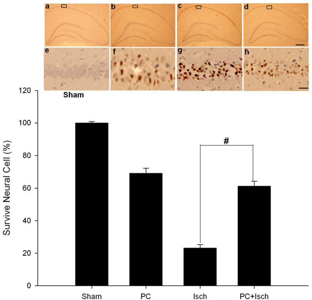 Effect of ischemic preconditioning on ischemia-induced neuronal cell loss in hippocampal CA1 regions.Animals were subjected to preconditioning (PC), global ischemia (Isch), or preconditioning followed by ischemia (PC + Isch), by the four-vessel occlusion paradigm (PC, 3 min, 48 h before Isch, 15 min), followed by reperfusion. Five days later, brains were fixed with paraformaldehyde followed by preparation of coronal sections from paraffin-embedded brains and subsequent staining with cresyl violet to determine cell survival in neuronal layeres of the hippocampi (n = 5). The boxed areas of CA1 subfield are shown at higher magnification, and the number of viable neurons in these areas was counted. Images of hippocampi at lower magnification (× 40) are a – d, and images at higher (× 400) are e – h. Error bar, 30 um. Data are mean ± S.D. # p < 0.01 by nonparametric ANOVA followed by Dunn’s analysis comparing with ischemic rats.