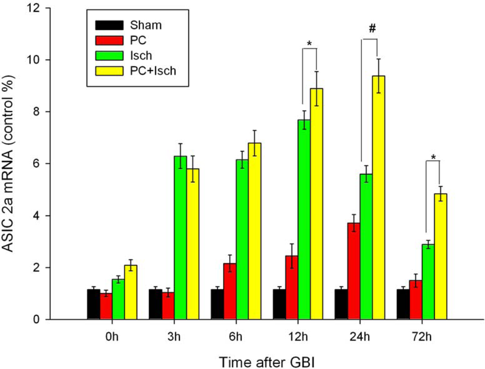 The time-course of ASIC 2a mRNA expression (as measured by quantitative RT-PCR) in the hippocampal CA1 region for all experimental groups is shown in Figure 3. We found that global ischemia induced a marked increase in ASIC 2a mRNA within three hours of ischemia. Expression was maximal at 12 h and diminished within 72 h. Preconditioning prior to the ischemic insult significantly up-regulated ASIC 2a mRNA compared to the ischemic insult alone (p < 0.01 at 24 h and p < 0.05 at 12 or 72 h, Figure 3). The increase in ASIC 2a mRNA expression in the hippocampal CA1 region in the preconditioned group (PC + Isch) was maximal at 24 h and persisted even at 72 h.