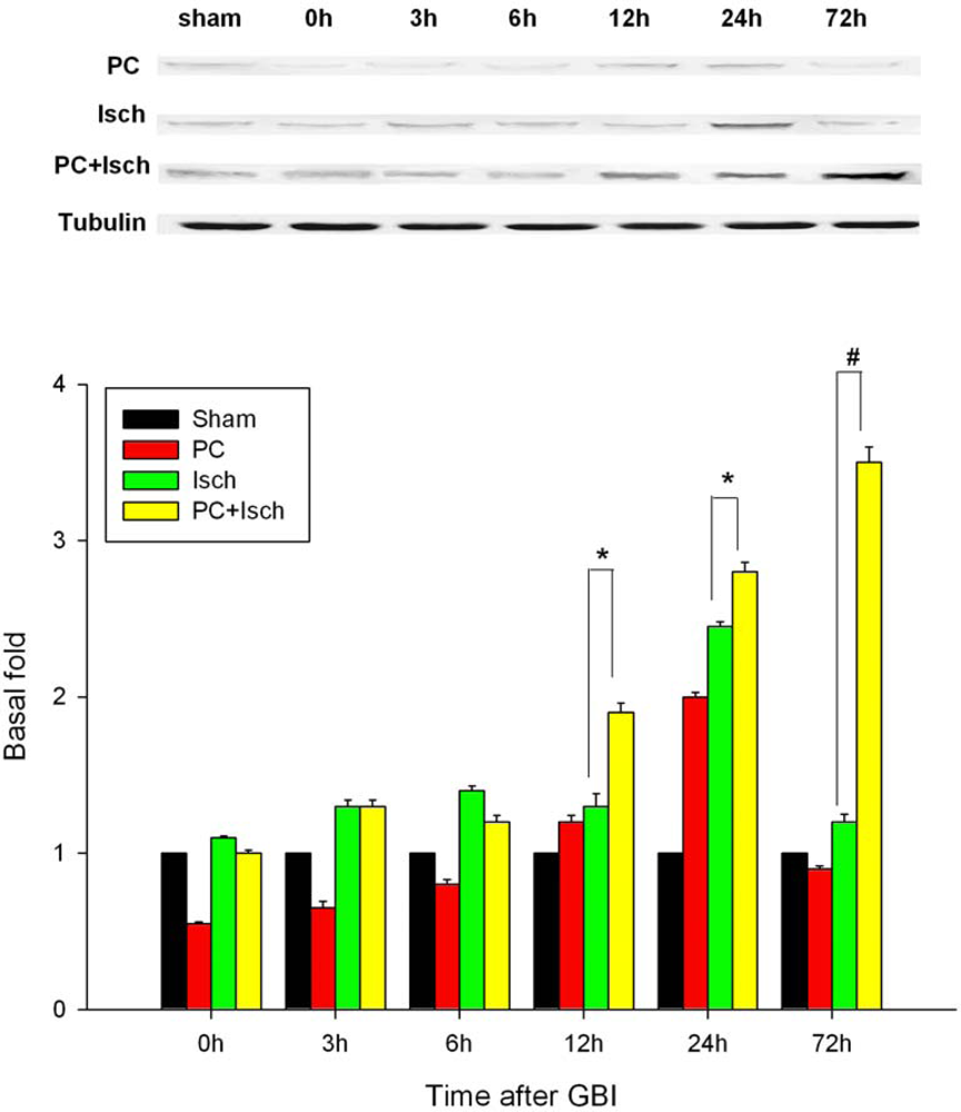 Western blotting analysis of ASIC 2a activations and expressions in hippocampal CA1 regions.Animals were subjected to preconditioning (PC), global ischemia (Isch), or preconditioning followed by ischemia (PC + Isch), by the four-vessel occlusion paradigm (PC, 3 min, 48 h before Isch, 15 min), followed by reperfusion. Rats were decapitated at 0 h, 3 h, 6 h, 12 h, 24 h or 72 h after reperfusion. Extracts from the hippocampi of the rats and sham controls were subjected to Western blotting with anti-ASIC 2a protein. Data are mean ± S.D. (n = 5). * p < 0.05, # p < 0.01 by nonparametric ANOVA followed by Dunn’s analysis comparing with ischemic rats.