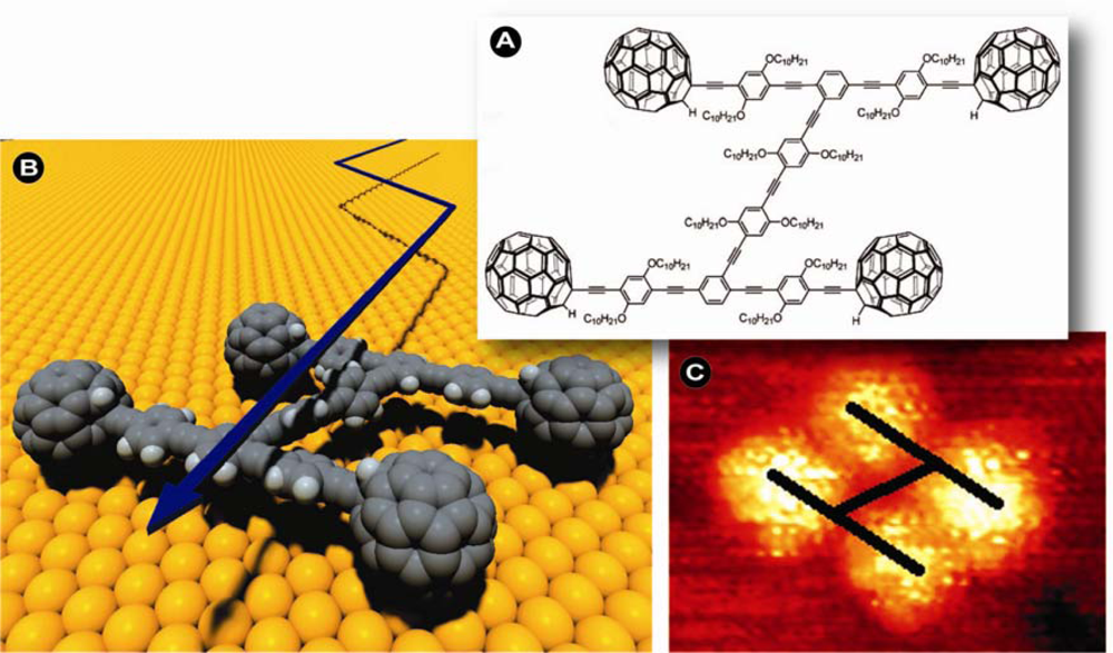 An example of nanotechnological progress, i.e., a thermally driven single-molecule nanocar capable of moving on a gold surface. (a) Structure of the nanocar (nanocar-1); fullerene wheels and chassis parts can rotate because of the alkyne connections, giving the nanocar the ability to roll on the surface and flexibility orthogonal to the surface plane. Synthesis and study of several related structures clarified that the alkyl units were critical for the solubility of the molecule. (b) Three-dimensional model and summary of the method of motion for nanocar-1, which consecutively pivots and then translates perpendicular to its axes. For clarity, the structure is drawn devoid of the alkoxy units. (c) High resolution scanning tunneling microscope (STM) image of nanocar-1 on an Au(111) surface (Vb = 0.4 V, It = 60 pA). Bright features are fullerene wheels; intramolecular oligo(phenylene ethynylene) and alkyl groups are not visible. Images courtesy of James M. Tour and reprinted with permission from [2] (© 2005 American Chemical Society).