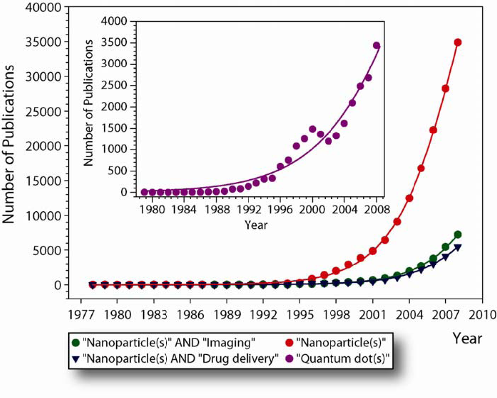 Developments in this novel field of science at the boundary between physical, chemical, biological and medical science, i.e., “Bionanotechnology”, have been relatively slow at the beginning, but momentum is taken up and current developments are progressing exponentially, as semi-empirically deducible from the increase in the yearly number of publications (Figure 2). This normally is an indication that a new technology is maturing and this is certainly the case for a number of nanoparticles currently employed for research purposes. Evolutionary progress is complementary in the fields of nanotechnology and biotechnology, and there is a constant technological exchange and traffic between these. Nanoparticles are not only used to elucidate and study biological processes, but biomolecules, viruses, and cells are being used to fabricate and organize nano-materials that could not be produced via synthetic techniques alone. The impact that nanostructured materials are already having on biological and biomedical research is profound. One of the most exciting applications are imageable nanoparticles, foremost fluorescent semiconducting quantum dots (Qdots).