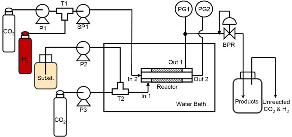Schematic diagram of the catalytic membrane reactor. SP1: Syringe pump; P1: CO2 delivery pump; P2: Reciprocating liquid pump; P3: CO2 delivery pump; T1 & T2: T-shape mixer, Reactor: High-pressure membrane reactor, In 1: Inlet of outer tube of Reactor; In 2: Inlet of inner tube of Reactor, Out 1: Outlet of out tube of Reactor; Out 2: Outlet of inner tube of Reactor; R2: Reaction Chamber, R3: Outlet compartment of the reaction chamber; PG1: Pressure Gauge for outer tube of Reactor, PG2: Pressure Gauge for inner tube of Reactor; BPR: Back Pressure Regulator.