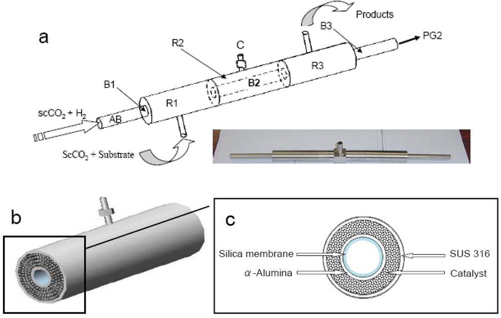 Figure 1 shows the schematic flow model of the novel catalytic membrane flow reactor (CMFR). The cylindrical reaction unit of the CMFR is placed in a constant temperature water bath to maintain the reaction temperature. A detailed description of the reactor unit is given described in the following section. Hydrogen gas is introduced into the syringe pump SP1 (ISCO DX260), then CO2 added into the syringe pump SP1 up to the desired pressure by JUSCO 880 PU CO2 delivery pump P1. Syngas (H2 + CO2) was delivered into the inner tube of the membrane reactor (AB in Figure 2a) from In 1. The substrate stream from high pressure pump P2 was mixed at T2 with scCO2 delivered by P3 (JUSCO CO2 delivery pump), then introduced into the membrane reactor through In 1. Pressure gauges PG1 and PG2 are used to monitor the exact pressure of the reaction unit. Total pressure was controlled by a JUSCO Back Pressure Regulator (BPR). Finally, the product was collected in the trap which is cooled at 0 °C by ice. Product yields were obtained by GC analysis (Varian CP-3800) with tridecane as a standard, and the identities of all products were confirmed by GC-MS (Varian CP-3800-1200L), using authentic samples for comparison.