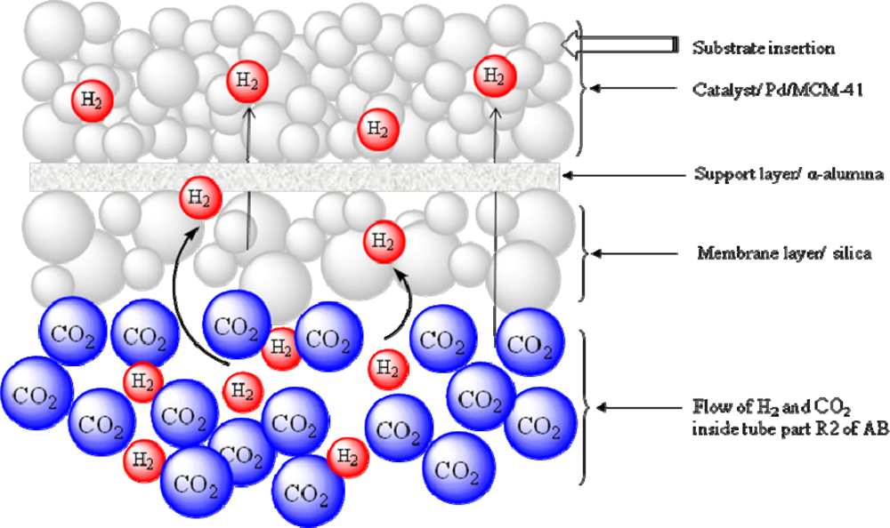 A mesoporous silica membrane was fabricated on the inner wall of the α-Al2O3 support (tube B2). In the case of the outer tube, two stainless steel nets are connected between R1-R2 and R2-R3. The space between the inner tube (B2) and outer tube (R2) was filled with the catalyst through the port C, and closed securely to prevent any leakage of reactant gases. The pore sizes of the nets are maintained in such way that the catalysts can be retained in the reaction chamber letting the product go out from the system through the outlet attached with chamber R3. Figure 2c shows the cross section of the main part of CMFR (Figure 2b). Figure 3a shows the TEM image of the mesoporous silica membrane that was installed inner wall of the inner tube, and Figure 3b shows the TEM image of Pd/MCM-41 catalyst whose pore size is 3.52 nm, surface area is 981 m2/g, and loaded Pd (nano particle) is ~1 wt %. Figure 4 shows the gas diffusion processes through the membrane. The premixed H2 and CO2 gases are being pumped by a high pressure pump P1 to the inner tube B2. The silica membrane is selective to the H2 gas and allows diffusion through porous silica membrane toward the catalyst chamber, which is one of the most significant points of this new reactor system. After entering into the catalytic bed H2 activates the metal catalyst active sites of the catalyst and reacts with substrate. The product is then collected through a back pressure regulator (BPR) using a cooled trap. In this newly developed reactor, any H2 selective porous inorganic membrane, such as zeolite membrane, alumina-silicate membrane, silica membrane or composite membrane can be used successfully.