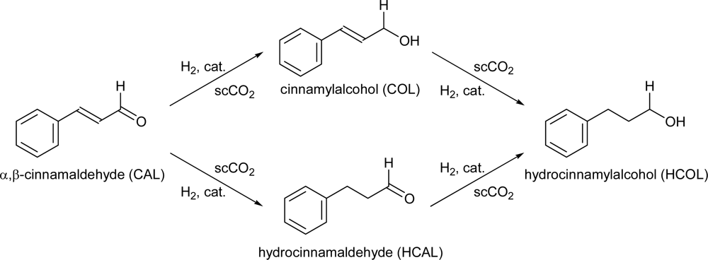 Hydrogeneration of cinnamaldehyde (α,β-unsaturated aldehyde) in scCO2.