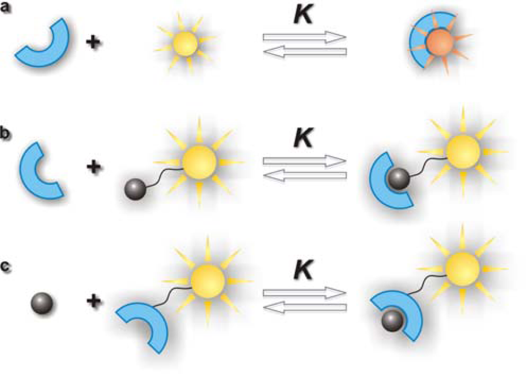 Fluorescent labelling of a host-guest complex (a) inclusion of a fluorescent guest (b) guest with attached fluorophore (c) host with attached fluorophore.