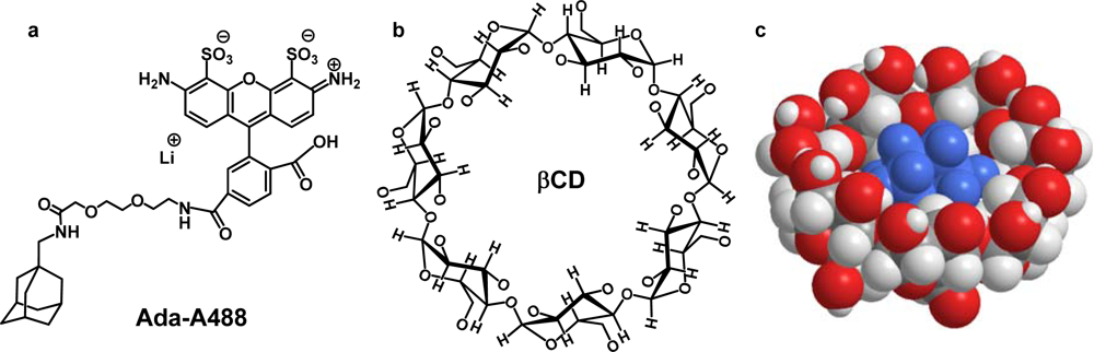 (a) Structure of Ada-A488 (b) Structure of βCD. (c) Sketch of an adamantane-βCD inclusion complex.