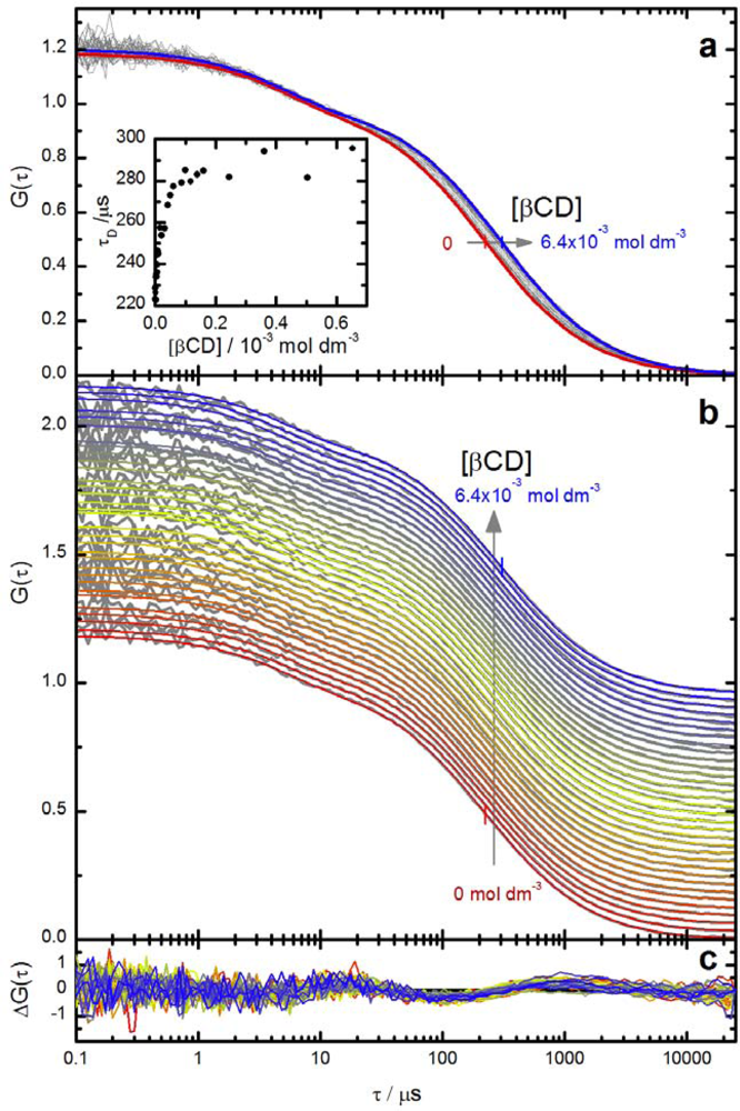 Fluorescence intensity correlation curves G(τ) of Ada-A488 in the presence of increasing concentrations of βCD ([βCD] = 0 mol dm−3 to 6.4 × 10−3 mol dm−3) in aqueous solution. ([Ada-A488] ≈ 10−9 mol dm−3). Panel a: normalized experimental correlation curves at increasing βCD concentration (grey curves) and two representative curves from the global fit of Equations. (9) and (10) at [βCD] = 0 mol dm−3 (red curve) and [βCD] = 6.4 × 10−3 mol dm−3 (blue curve) to the correlation curves. The intermediate fit curves are not shown for clarity. Small vertical bars indicate the diffusion time obtained from the fit. Inset: mean diffusion times τ̄D as function of βCD concentration determined from individual fits of the Equation (9) to the correlation curves. The highest concentrations are not shown. See also Figure 5. Panel b: stacked representation of the same correlation curves as in panel a. Panel c: weighted residuals from the global fit (vertical scale is arbitrary).
