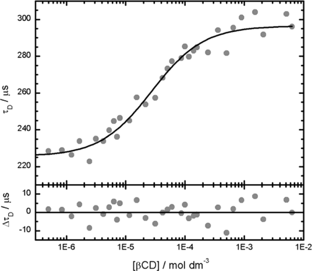 Upper panel: Mean diffusion times τ̄D as function of βCD concentration determined from individual fits of correlation function GDT [Equation (9)] to the normalized correlation curves of Figure 4. Parameter of the fit as given in the text. The black curve represents the best fit of Equation (10) to τ̄D with the parameter τf = 225 ± 2 μs, τb = 297 ± 2 μs, and K = (48 ± 7) × 103 mol−1dm3. Note that due to the logarithmic concentration scale the values at [βCD] = 0 M are not visible in the figure, although they are included in the fit. Lower panel: residuals of the fit.