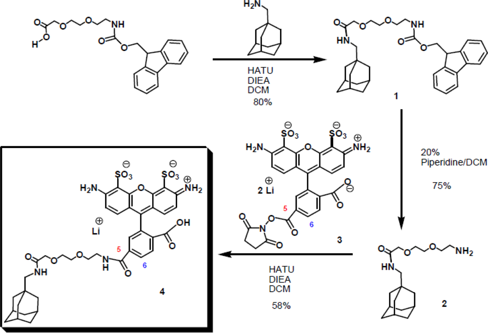 8-amino-3,6-dioxaocta-methyladamantane amide (2, 0.35 mg, 1.12 mmols) and Alexa Fluor 488 carboxylic acid succinimidyl ester (mixed isomers) (3, 0.2 mg, 0.31 mmols) were dissolved in dry DCM (500 mL) and dry DMF (20 mL), DIEA (1 mL, 5.5 mmols) was added and the mixture was stirred under argon for 1 h. The crude was purified by HPLC, affording (4, 0.15 mg) of compound as a pink solid [58%, Rt = 15 min and 16min for 2 isomers (Eclipse Inertsil analitic column, 50–80% MeOH 0.1%TFA in H2O 0.1%TFA in 19 min)].
