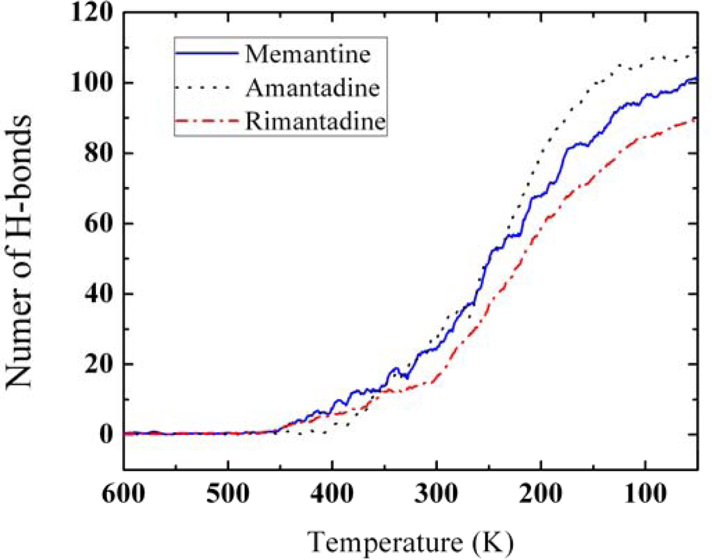 The number of hydrogen bonds for amantadine, memantine and rimantadine vs. temperature. As temperature decreases the numbers of hydrogen-bonds increase, and tend to maximum numbers for the three derivatives.