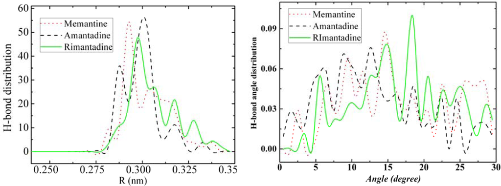 We also performed calculations of the hydrogen-bonds saturation as a function of temperature (as shown in Figure 12) as well as hydrogen-bonds distance distribution (as shown in Figure 13-left) and hydrogen-bonds angle distribution (as shown in Figure 13-right) for amantadine, rimantadine and memantine.