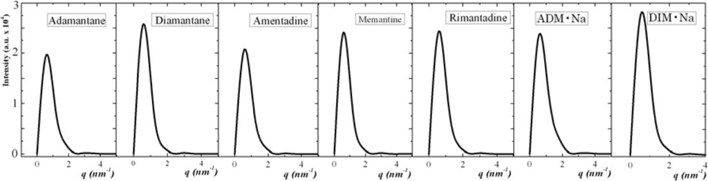 Structure factors of the seven diamondoids and derivatives (from left: Adamantane, Diamantane, Amantadine, Rimantadine, Memantine, ADM•Na., DIM•Na) in the self-assembled (solid) state.