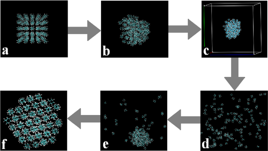 Stages of simulation procedure: (a) Initial 5 × 5 × 5 MD simulation box; (b) Molecules relaxed in vacuum at 100 K after a short MD simulation; (c) Boxed simulation system with overall gas density; (d) Gas phase as a result of equilibrating simulation in the NVT ensemble; (e) The liquid state; (f) Final self-assembly of molecules to solid state.