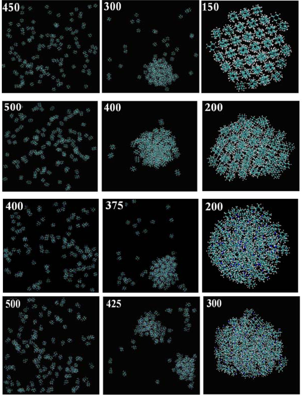 From these snapshots we can directly observe clear phase transitions for each kind of molecules, from the gaseous state to the liquid state, and then their aggregation into a highly condensed (self-assembled) state.