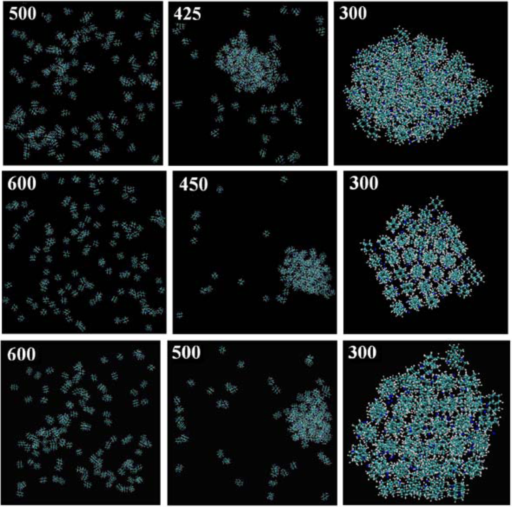 In order to find the equilibrium configuration of the collection of the 125 molecules at every given temperature we used the simulation annealing procedure [,]. Every change of 1 K occurred within 10 picoseconds (5,000 time-steps and each time-step was 0.002 ps). With these settings we could observe the self-assembly behavior in the cooling step.