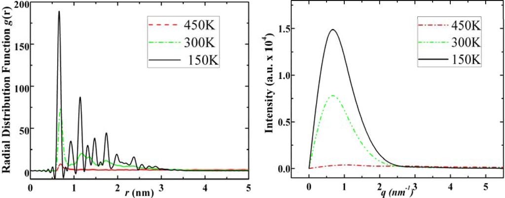 Radial distribution functions (left) and structure factors (right) of adamantane at 450 K, 300 K and 150 K for its gas, liquid and solid states, respectively.