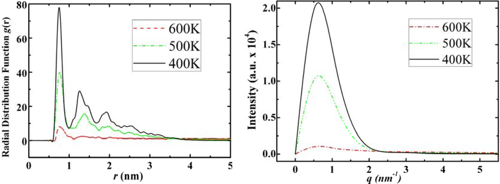 Radial distribution functions (left) and structure factors (right) of DIM•Na at 600 K, 500 K and 400 K for its gas, liquid and solid states, respectively.