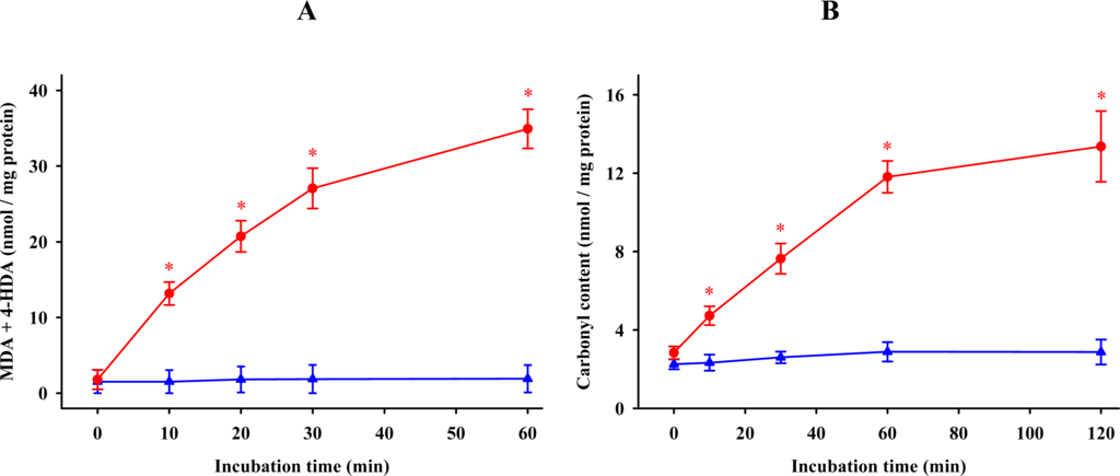 Incubation of synaptosomes in the absence of iron and ascorbic acid did not modify MDA + 4-HDA levels and synaptosomal protein carbonylation. However, the addition of 0.1 mM FeCl3 and ascorbic acid to the incubation medium resulted in the elevation of these indices in a time-dependent manner. Lipid peroxidation increased steadily during the first 30 min of the incubation period (Figure 1A). Since no statistically significant difference occurred between the 30 and 60 min measurements, we selected a 30 min incubation period for the subsequent studies. Similarly, protein carbonylation increased over the first 60 min and then reached a constant value (Figure 1B). Therefore, we conducted all additional studies for a time of 60 min.