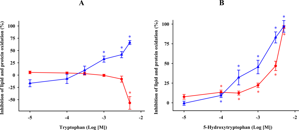 Consistent with our results, tryptophan promoted oxidative stress in the cerebral cortex of rats [26]. Moreover, in rats fed with tryptophan-supplemented diets, the amino acid appeared to enhance lipid peroxidation in plasma as well as several tissues [27,28]. On the other hand, tryptophan showed a weak antioxidant behavior which prevented the formation of the 2,2′-azino-bis(3-ethylbenz-thiazoline-6-sulfonic acid) (ABTS) cation radical by scavenging •OH and ROO• that was five orders of magnitude lower than melatonin [29]. The effect of tryptophan on protein oxidation agree with in vivo studies that have claimed that tryptophan reduces edema and oxidative stress in cerulein- or ischemia/reperfusion-induced pancreatitis [30] and accelerated the healing of gastric ulcers induced by administration of acetic acid, ethanol, and aspirin [31,32].