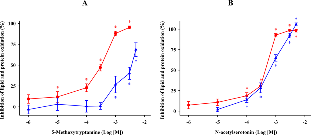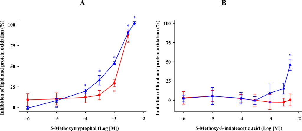Biosynthesis of 5-methoxytryptophol and 5-methoxy-3-indoleacetic acid occurs from serotonin and is catalyzed by monoamine oxidase and hydroxyindole-O-methyltransferase [64]. 5-Methoxytryptophol inhibited FeCl3 and ascorbic acid-induced lipid and protein oxidation in a dose-dependent manner (Figure 5A). The minimal effective concentration of 5-methoxytryptophol that significantly reduced oxidative damage was 0.1 mM (P ≤ 0.05). All concentrations of 5-methoxytryptophol greater than 0.5 mM caused progressively greater reductions in MDA + 4-HDA levels and protein carbonylation in synaptosomal membranes. However, 5-methoxy-3-indoleacetic acid failed to protect the membranes in terms of biochemical markers of oxidative stress. Only high levels (5 mM) of 5-methoxy-3-indoleacetic acid reduced the synaptosomal carbonylation by 46.1% (Figure 5B).