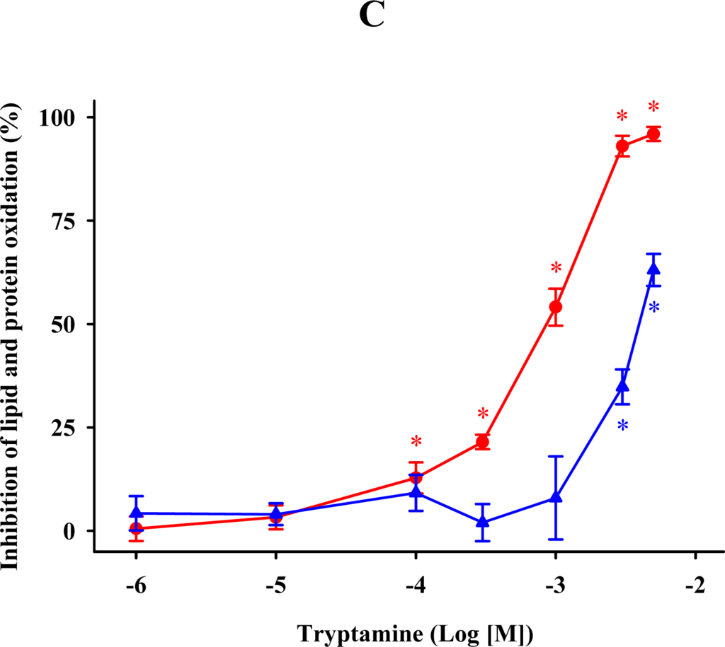 Little is known about the antioxidant ability of tryptamine. This molecule reduced the formation of thiobarbituric acid reactive substances (TBARS) induced by tert-butyl hydroperoxide, the hyperglycemia subsequent to treatment with alloxan [48], and the nitration of the amino acid tyrosine caused by ONOO− [49]. All these results and our data are in agreement with the observation of Poeggeler et al. [29] who calculated the reaction rates of tryptamine in scavenging •OH and ROO• as 0.80 × 106 and 0.96 × 106 mol·L−1·s−1, respectively.