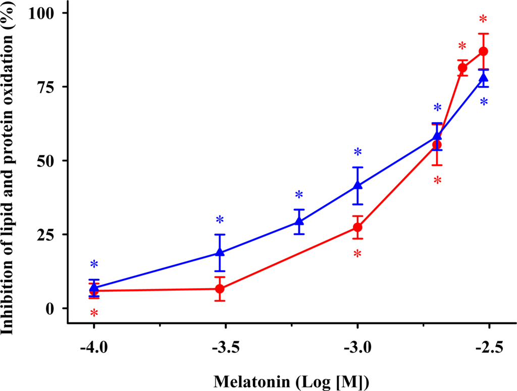 Melatonin’s inhibitory effects of iron- and ascorbic acid-induced lipid and protein oxidations are concentration-dependent (Figure 4). Melatonin at 3 mM prevented both oxidative indices almost completely; in this case, no significant differences in MDA + 4-HDA concentration and carbonyl contents were observed relative to control membranes without FeCl3 and ascorbic acid.