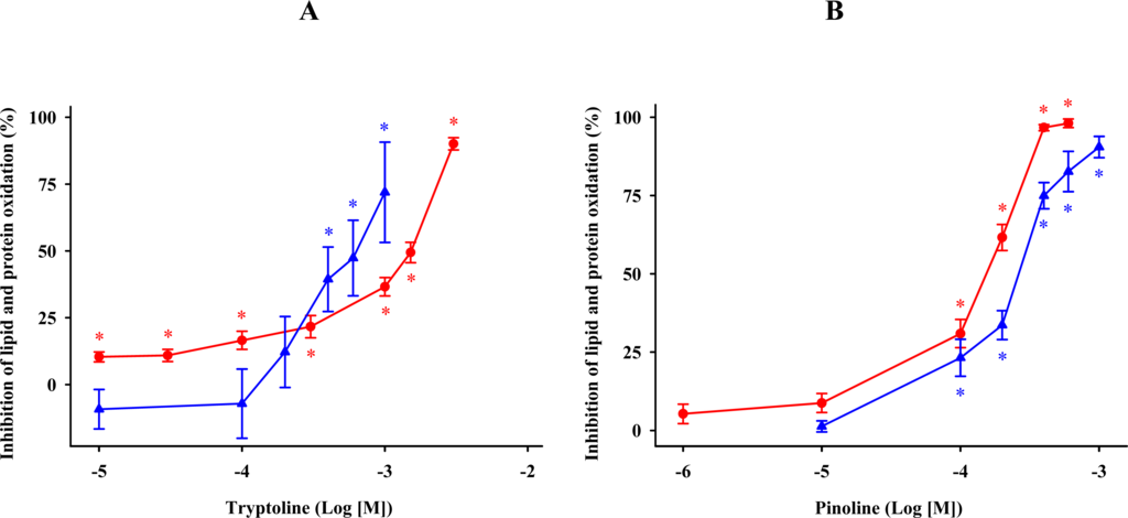 β-carboline formation has been proposed via the Pictet-Spengler reaction by condensation of indoleamines with aldehydes [64,67]. We observed that progressively increasing concentrations of tryptoline or pinoline prevented MDA + 4-HDA formation and protein carbonylation in a concentration-dependent manner (Figure 6). Pinoline proved to be more potent than tryptoline in reducing lipid and protein oxidation. These data agree with a previous study showing that pinoline was more active in reducing lipid peroxidation in brain homogenates exposed to hydrogen peroxide [68]. Tryptoline differs from pinoline in the absence of the methoxy group. It has been proposed that methoxylated tryptophan derivatives are more effective antioxidants than hydroxylated compounds [12,29]. The data reported here for β-carbolines is consistent with this observation. Several reports have claimed that pinoline reduced lipid peroxidation induced by hydrogen peroxide, iron, sodium nitroprussiate, copper (I) iodide, aluminum, and glutamate [24,44,60,68–71]. Herein, we show for the first time that tryptoline also reduces oxidative stress in synaptosomal membranes. As for pinoline, our data are in agreement with two previous studies stating that pinoline limits oxidative damage to proteins in synaptosomes [24,60].