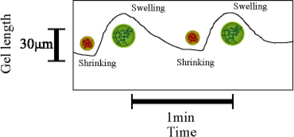In this review, we introduce active polymer gel actuators. Gels exhibit a unique capability of undergoing spontaneous volume changes in response to oscillatory chemical reaction. For example, gels can undergo rhythmic swelling and shrinking in response to variations in the pH of the surrounding solution caused by an oscillating reaction. The pH oscillations were generated by the Landolt reaction [15] or by an enzymatic reaction [16]. Periodical volume changes were also observed in a pH responsive gel, which exhibited bistability with diffusion of a reactive substrate into the gel [17]. In all these studies, the cause of the complex behaviors was outside of the gels. Furthermore, the chemical reactions were carried out under nonequilibrium conditions provided by precisely controlled continuous-flow stirred tank reactors [15,17]. This means that the condition around the gel is not stationary. A self-oscillating gel that moved under stationary conditions is only known [18]. The self motion of the gel is produced by dissipating chemical energy of the oscillatory Belousov-Zhabotinsky (BZ) reaction [19]. The BZ reaction is the most commonly known oscillating reactions. The overall process is the oxidation of an organic substrate such as citric or malonic acid by an oxidizing agent (bromate) in the presence of a metal catalyst under acidic condition. Metal ions or metal complexes with high redox potentials, such as cerium ion, ferroin, or ruthenium tris(2,2′-bipyridine) are widely used as catalysts. In the course of the reaction, the catalyst ion periodically changes its charge number to oscillate between the oxidized and reduced states for several hours as long as the substrate exists. In an unstirred solution, there are chemical waves and spatial pattern formations in the reaction process. The use of the gels in the BZ reaction has been so far confined to eliminating hydrodynamic convection disturbing reaction diffusion patterns [20] and localizing the BZ reaction in a restricted region [21]. In this systems, the structure of gels do not change by the BZ reaction because the interaction between the gel structure and the reaction diffusion system is negligibly small. It was reported that liner polymers and gels undergo a slight spontaneous structure changes [19,22,23]. In oscillating gel system, the polymer networks itself takes part in the BZ reaction, because the metal catalyst is covalently bounded to the polymer chain. As a result, the reaction medium can change in time and space. In other words, the BZ reaction induces the structural changes. When the redox state of the metal catalyst moiety in the gel changed, the solubility of the polymer chain changed as well. As a result, the change in the osmotic pressure inside the gel causes the swelling or shrinking of the polymer gel. The displacement of the self-oscillating gel is several dozen micrometers [19] as shown in Figure 1. However, the mechanical displacement of the gel was too small to design the gel actuator. Therefore, in order to construct gel actuators, we should improve the displacement of the gel greatly.