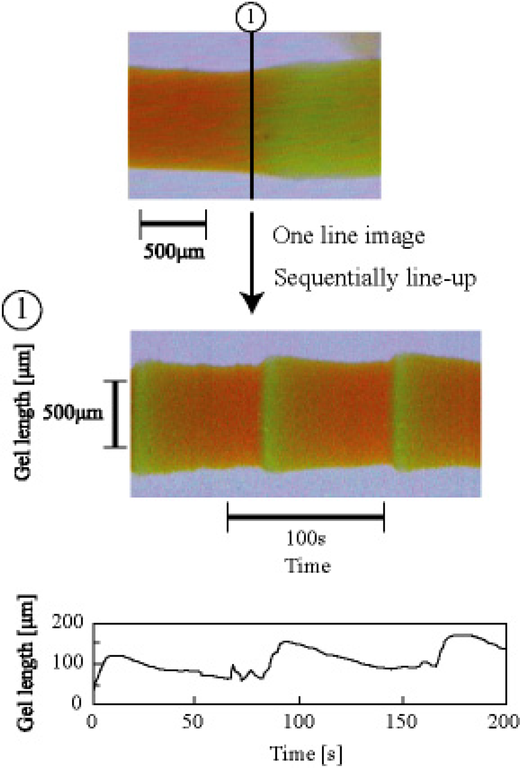 Figure 9 shows the periodical peristaltic motion of the gel driven by the chemical waves of the BZ reaction. We first succeed in observing the periodical peristaltic motion of the gel directly. With the propagation of the chemical waves, the local swelling regions propagated in the gel. This is the first visual evidence of the peristaltic motion of the gel in the macroscopic scale. The shape change of the gel was in excellent agreement with the theory [26,27]. The aspects of the volume change of the gel followed the reaction diffusion dynamics. The chemical wave speed of the BZ reaction was approximately 14.0–30.0 μm/sec in the gel. Figure 10 shows the spatio-temporal diagram constructed from the sequential images. The width of the gel changed shape periodically with about 150 μm. As shown in Figure 8, the change in the width of the gel increased c.a. 20% from the initial width of the gel. The period of the volume oscillation was about 86 sec.