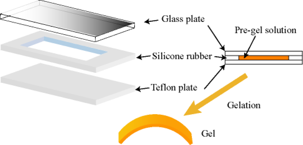 For realizing the large deformation of the gel, we adopted the method of introducing a gradient structure into the gel. In order to make the gradient structure in the gel, we utilized the hydrophobic interaction between the Ru(bpy)32+ moiety and the casting mold during the polymerization. As a result, the large deformation of the self-oscillating gel was achieved [24]. During the polymerization, the monomer solution faces two different surfaces of plates: a hydrophilic glass surface and a hydrophobic, Teflon surface. as shown in Figure 2.