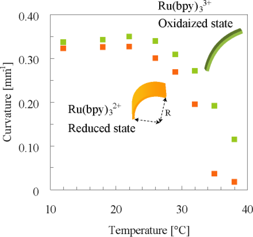 Equilibrium swelling ratio expressed as curvature of the poly(NIPAAm-co-Ru(bpy)3-co-AMPS) gel with gradient structure. Closed square: Ce2(SO4)3 = 0.005 M and HNO3 = 0.894 M; Open square: Ce(SO4)2 = 0.005 M and HNO3 = 0.894 M. The curvature is defined as 1/R. Reproduced from [25].